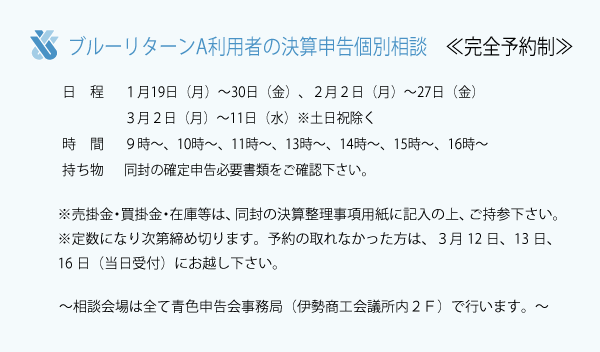■ブルーリターンA利用者の決算申告個別相談≪完全予約制≫